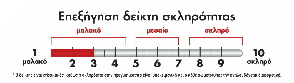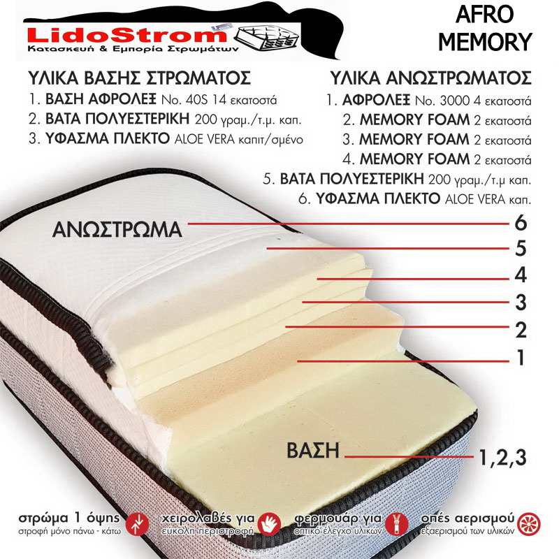 Είναι στρώμα μονής όψης δηλαδή δεν αναποδογυρίζεται, αφού αποτελείται από κάτω σκληρή βάση (foam) και άνω μαλακή πλευρά ανωστρώματος με μαλακό memory foam & πολύ μαλακό foam.